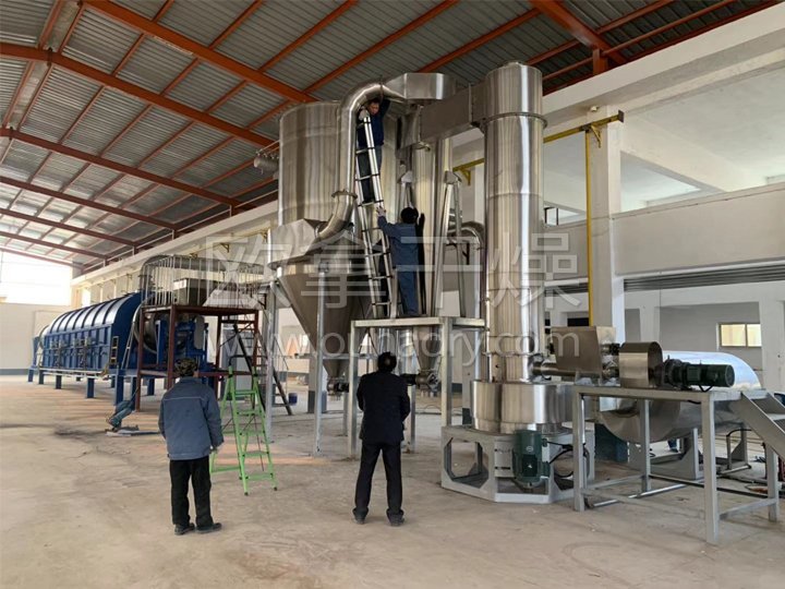 熱空氣切線進入干燥器底部,在攪拌器帶動下形成強有力的旋轉(zhuǎn)風場。膏狀物料由螺旋加料器進入干燥器內(nèi),在高速旋轉(zhuǎn)攪拌槳的強烈作用下,物料受撞擊、磨擦及剪切力的作用下得到分散,塊狀物料迅速粉碎,與熱空氣充分接觸、受熱、干燥。脫水后的干物料隨熱氣流上升,分級環(huán)將大顆粒截留,小顆粒從環(huán)中心排出干燥器外,由旋風分離器和除塵器回收,未干透或大塊物料受離心力作用甩向器壁,重新落到底部被粉碎干燥。